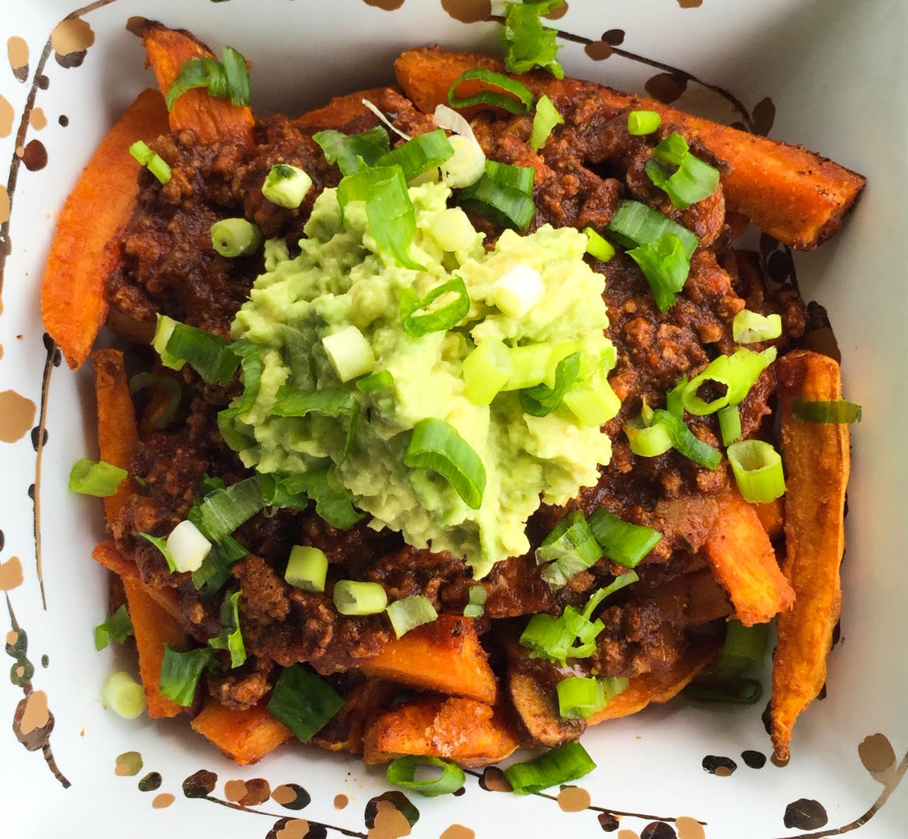 I loveeee Chili and this is definitely my best combo thus far! Sweet Potato Fries mixed with the savory flavors of chili, and the creaminess of guacamole, just spells out F-E-E-D M-E NOW! This dish is very easy to make and was designed to be a healthier version of the regular Chili Fries by substituting english potato with sweet potato, using ground turkey instead of ground beef, and guacamole instead of cheese. I hope you enjoy 🙂